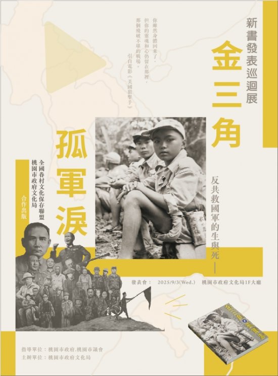 | 一、 | 由桃園市政府文化局與全國眷村文化保存聯盟共同出版的《金三角孤軍淚-反共救國軍的生與死》,聚焦 38 年國軍退守金三角的歷史,透過口述訪談與珍貴影像,真實呈現雲南反共救國軍在泰緬邊境三十年的奮戰歷程,歡迎有興趣的民眾至馬祖新村參觀「孤軍淚新書發表巡迴展」。 |