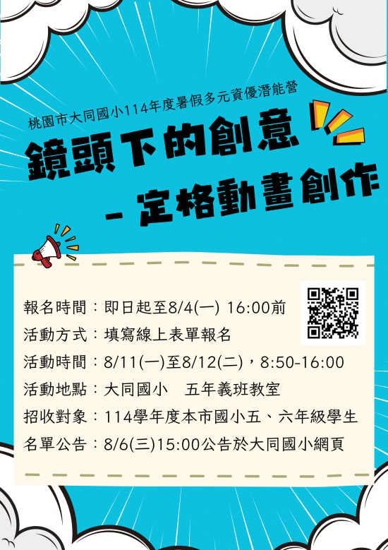 | 2.錄取名單將於 114/8/6(三)15:00 公告於大同國小網頁,敬請留意錄取後注意事項。 |